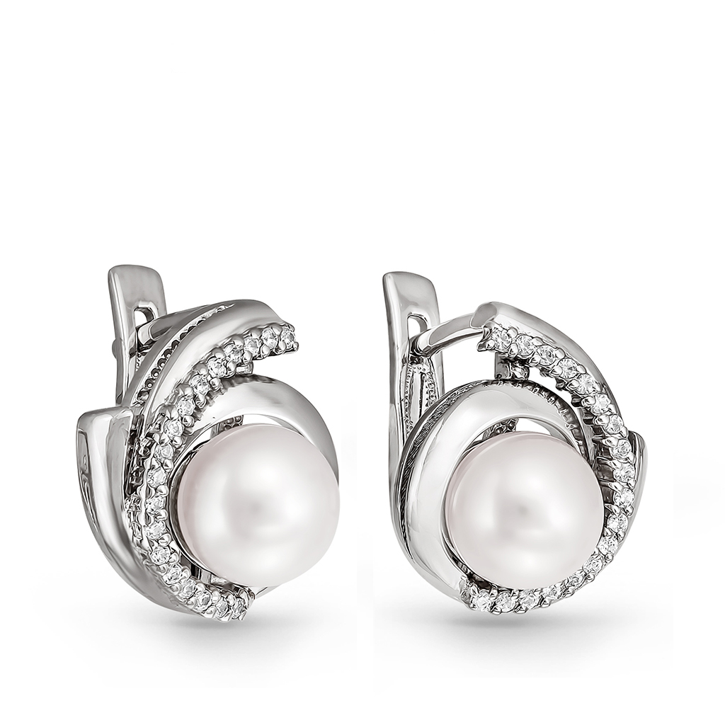 Серьги с английским замком из серебра с фианитами, жемчугами