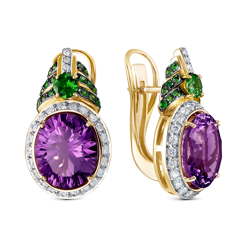 Серьги из желтого золота с тсаворитами, аметистами, бриллиантами