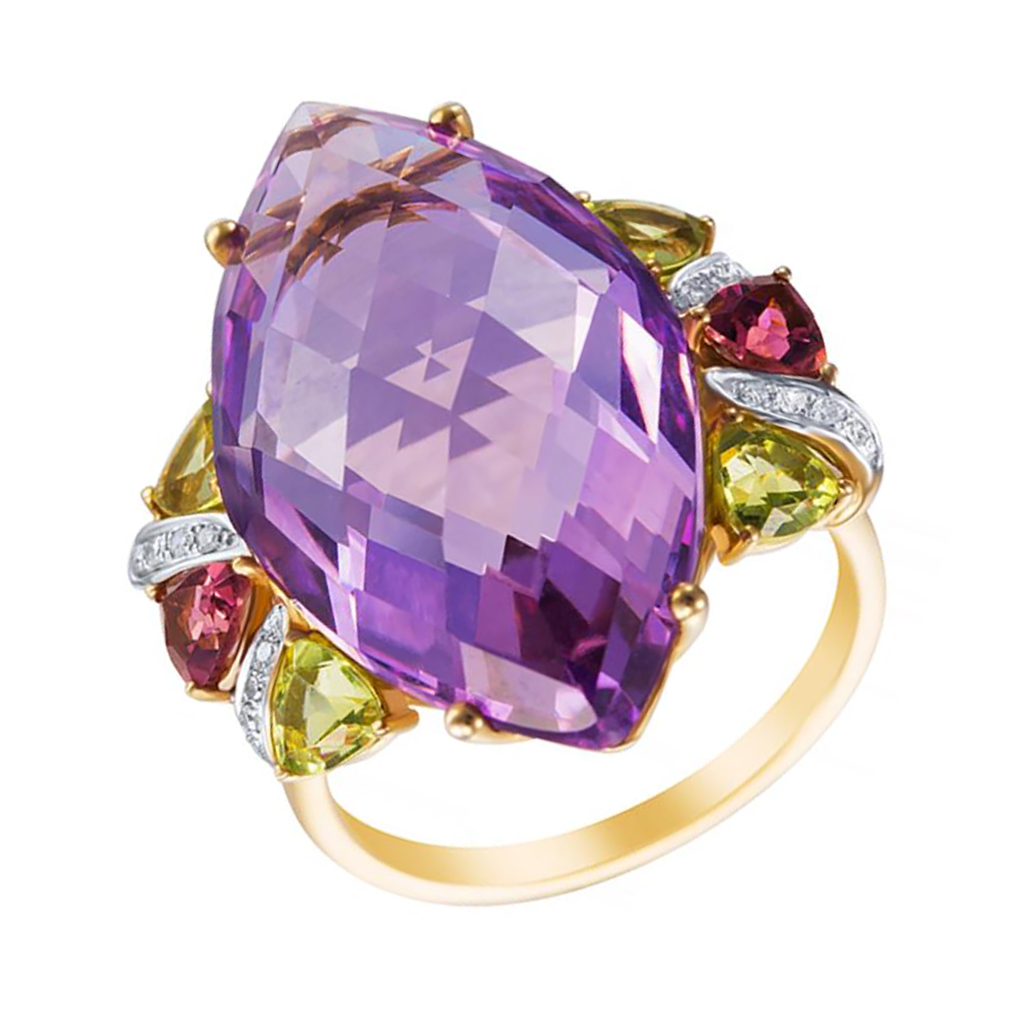 Кольцо из желтого золота с бриллиантами, аметистом, цветными