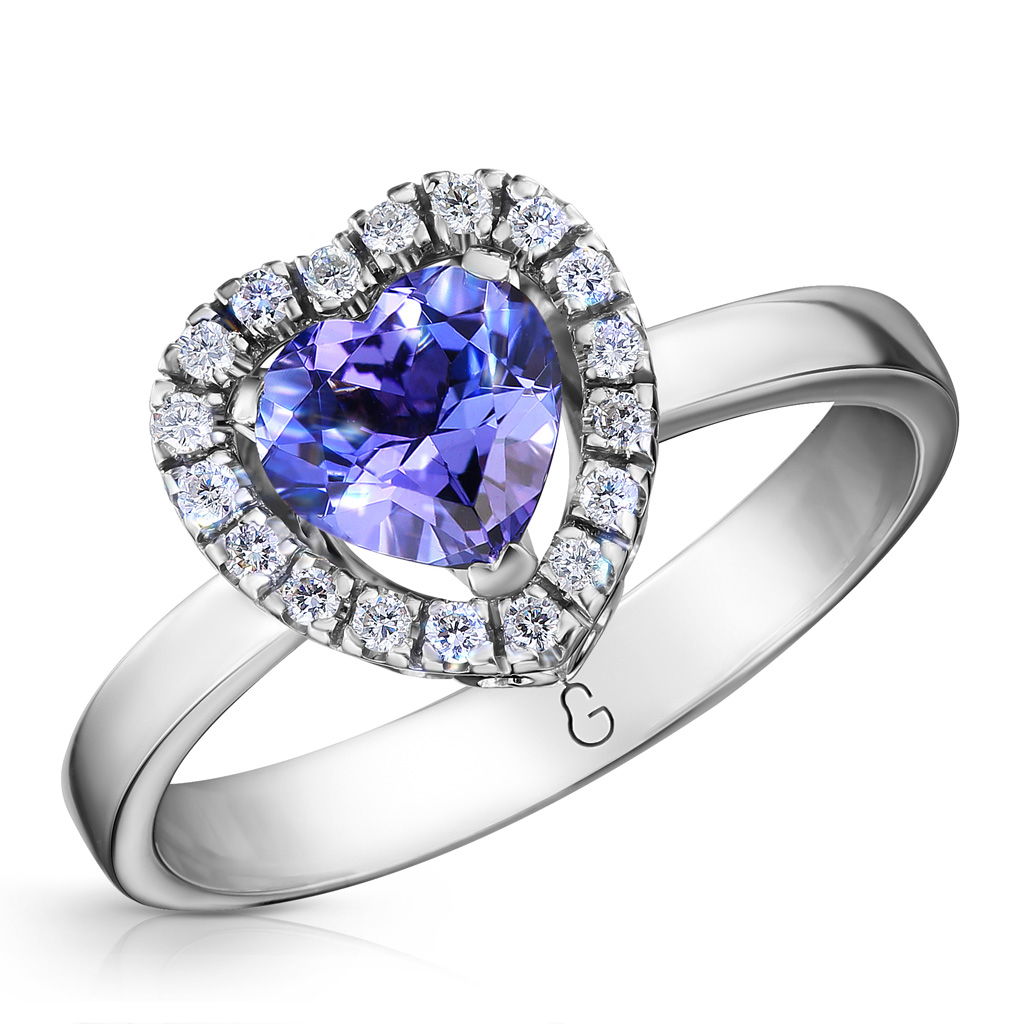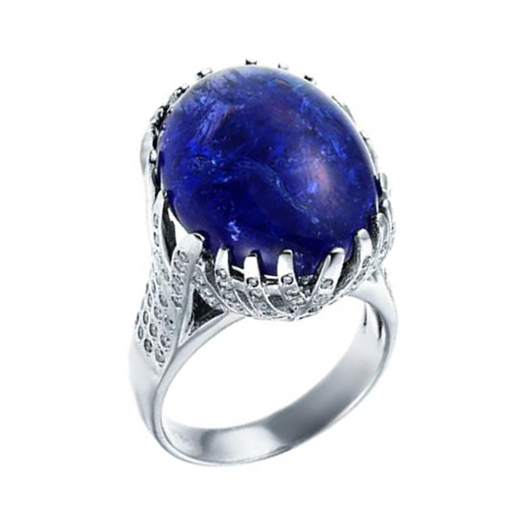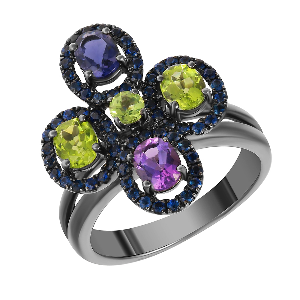 Кольцо из черненого золота с сапфирами, аметистом, иолитом, перидотами