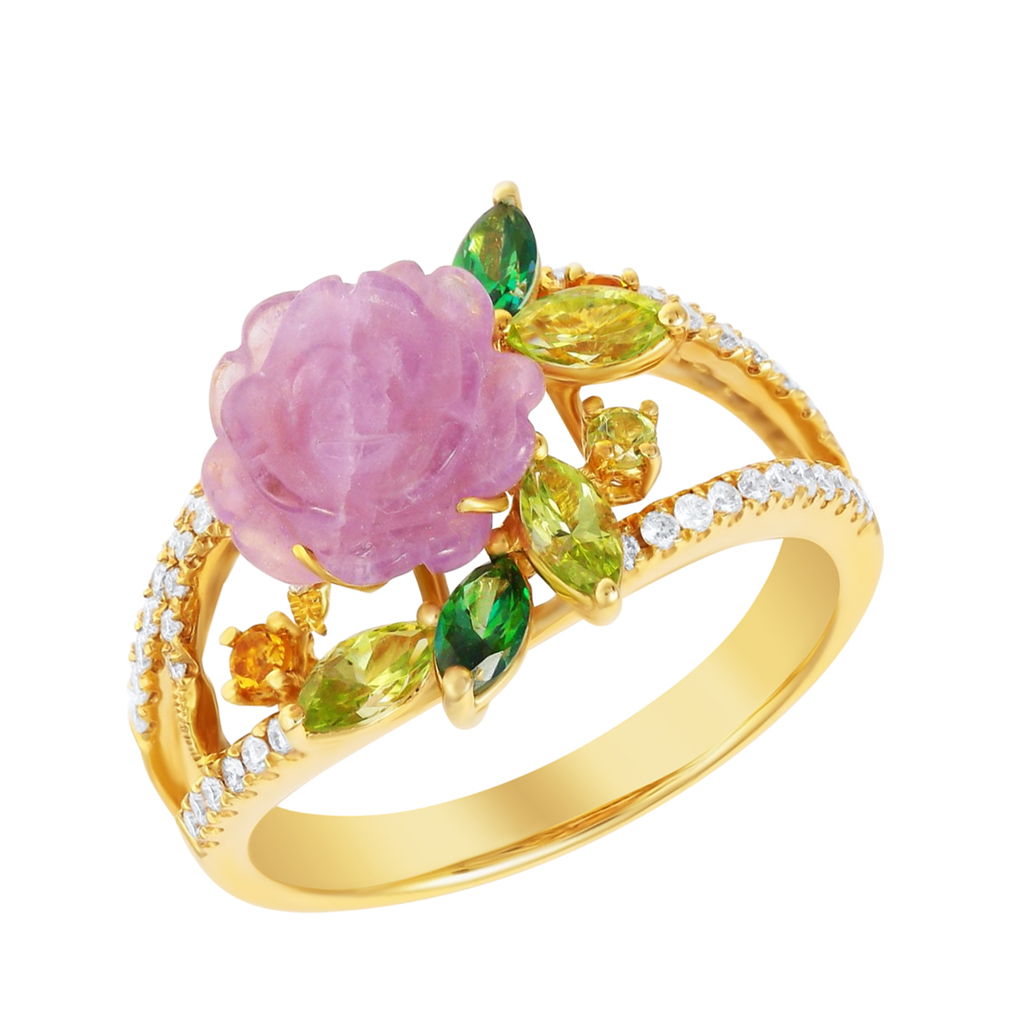 Кольцо из желтого золота с цаворитами, бриллиантами и аметистом