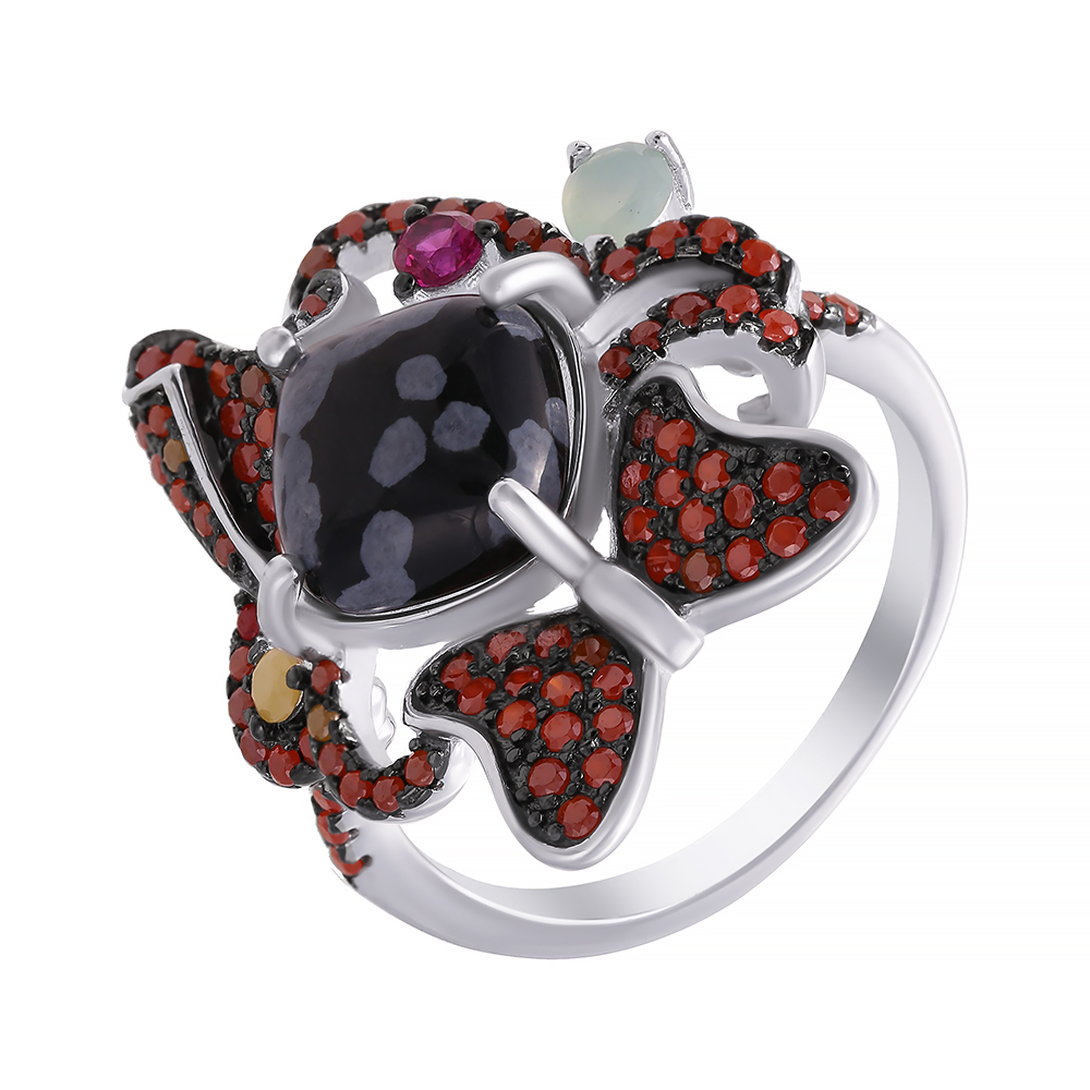 Кольцо из серебра с обсидианом, фианитом
