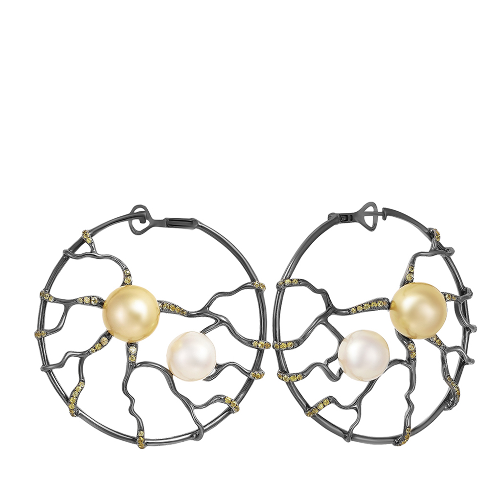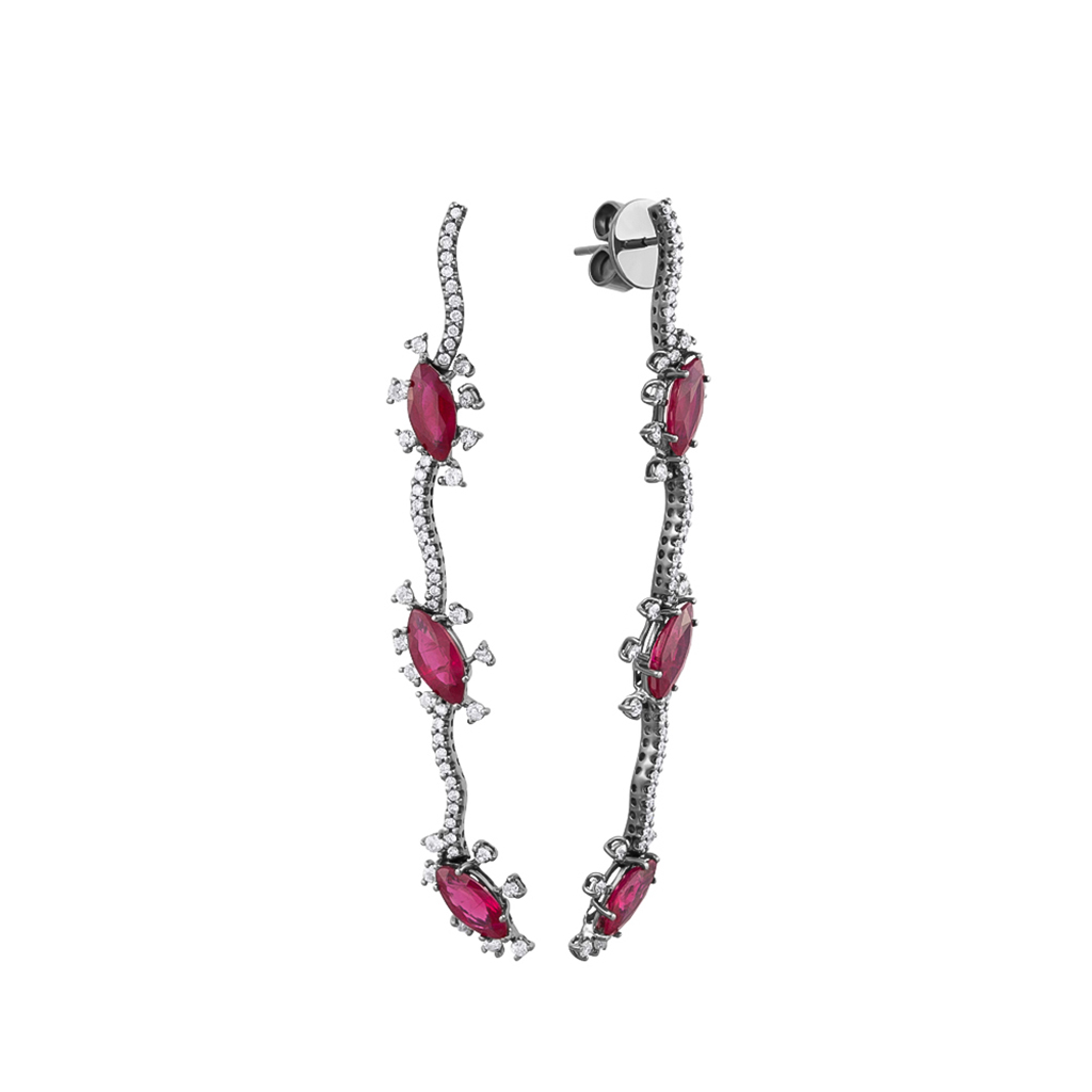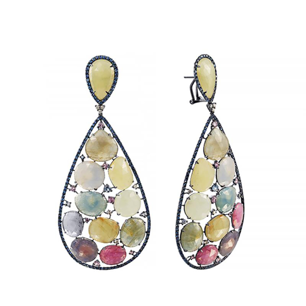 Серьги из черненого золота с бриллиантами, сапфирами, корундами
