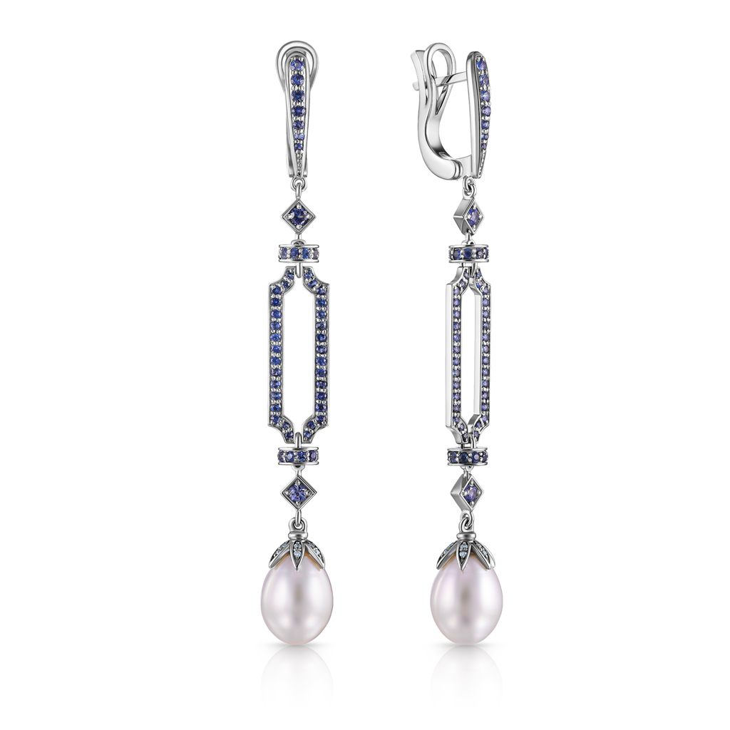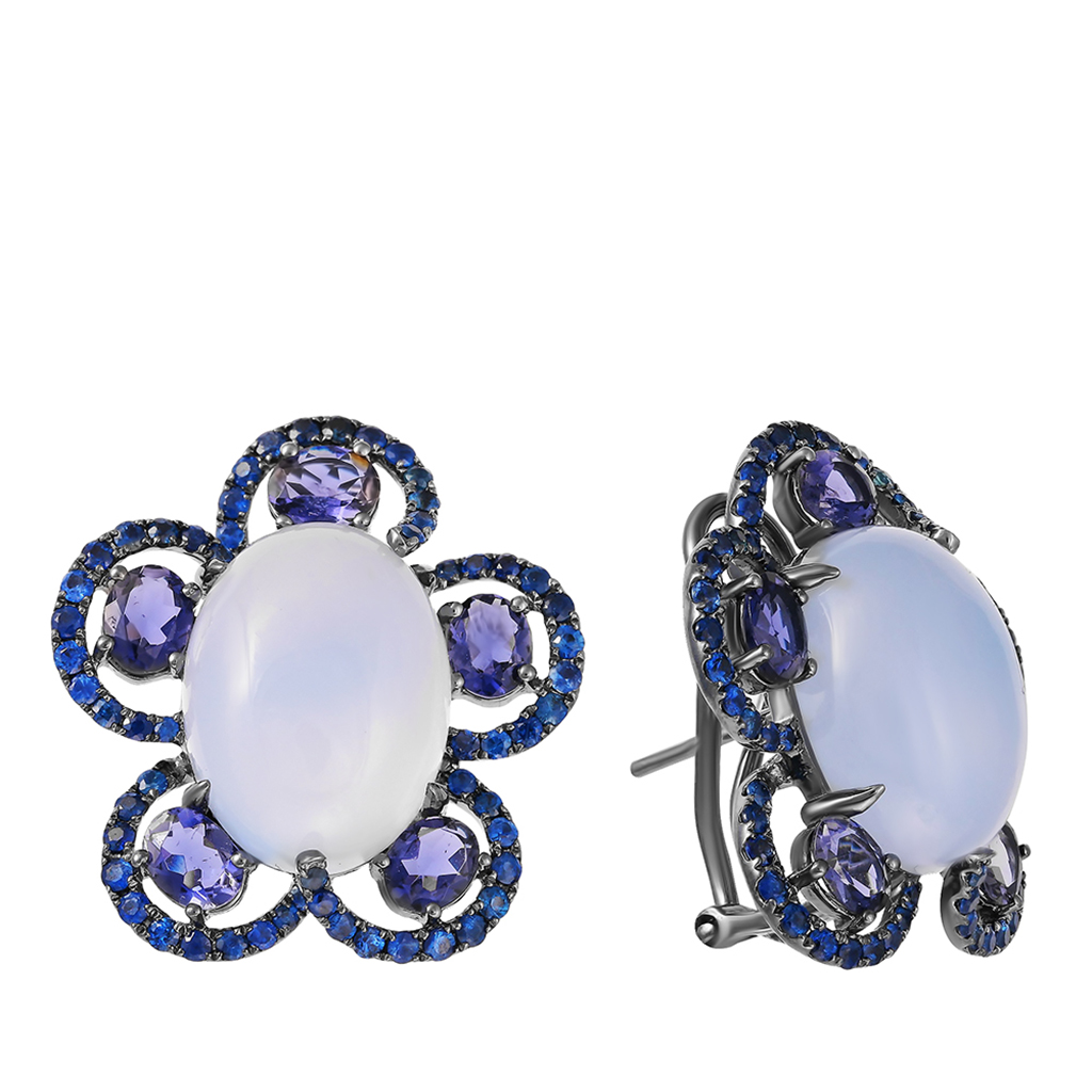 Серьги из черненого золота с сапфирами, иолитами, халцедонами