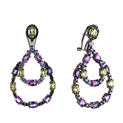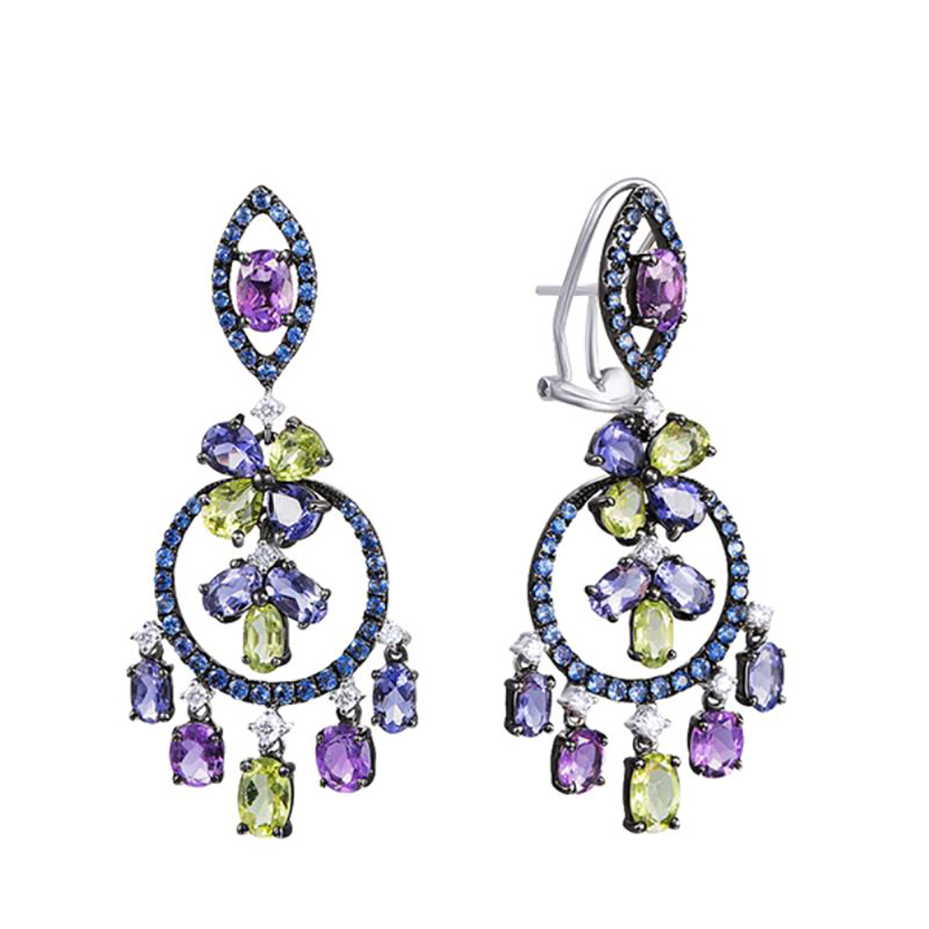 Серьги из белого золота с бриллиантами, иолитами, аметистами, сапфирами, перидотами