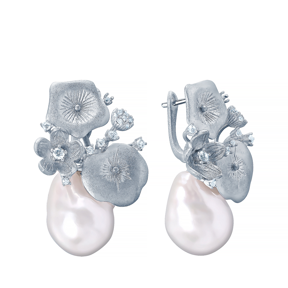 Серьги с английским замком из серебра с жемчугом, фианитом