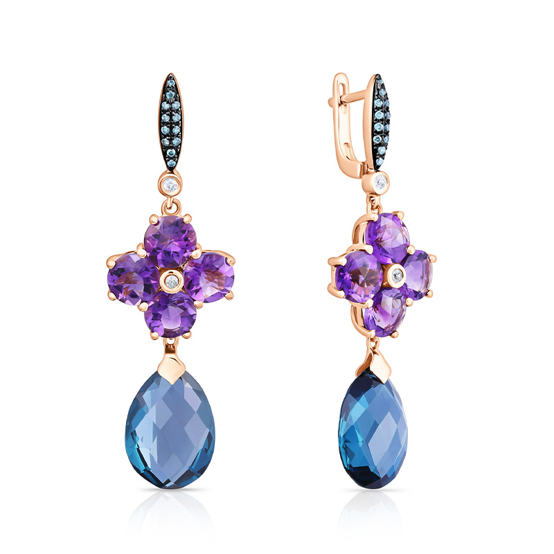 Серьги из желтого золота с бриллиантами, сапфирами, аметистами и топазами