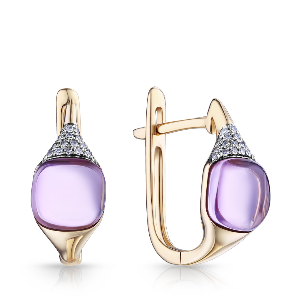 Серьги с английским замком из красного золота с бриллиантами и кварцем