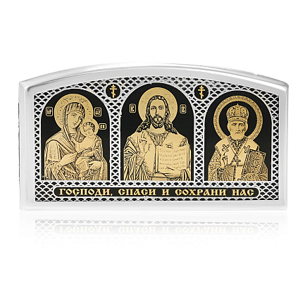 Рисунок выполнен лазером на обсидиане, оклад - серебро 925, вес серебра 5г, на основе из натуральной кожи. На лицевой стороне дорожной иконы изображены: Казанская Божья Матерь – покровительница семьи, Господь Иисус Христос (образ Спасителя), Святитель Николай Чудотворец – скорый помощник и заступник, которому молятся в путешествиях.