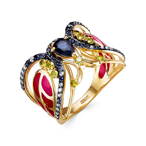 Кольцо из желтого золота с бриллиантами, эмалью и сапфирами