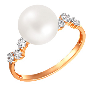 Кольцо из красного золота с жемчугом, фианитом