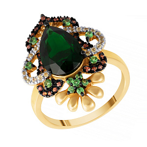Кольцо из желтого золота с сапфирами, цаворитами и кварцом