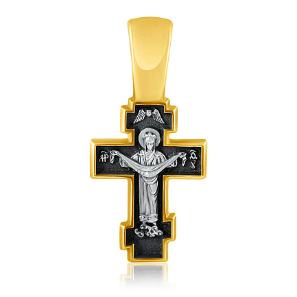 На лицевой стороне креста изображено Распятие Иисуса Христа. На обороте - икона Покрова Пресвятой Богородицы. Праздник Покрова Божией Матери является воспоминанием чуда: Пресвятая Богородица явилась верующим над алтарем храма и распростерла над ними свое покрывало. В этот день Божья Матерь открыла людям, что Она является Ходатаицей за них перед Богом. Богородица простирает свой молитвенный покров над всеми православными христианами и умоляет сына своего о даровании вечного спасения каждому человеку.