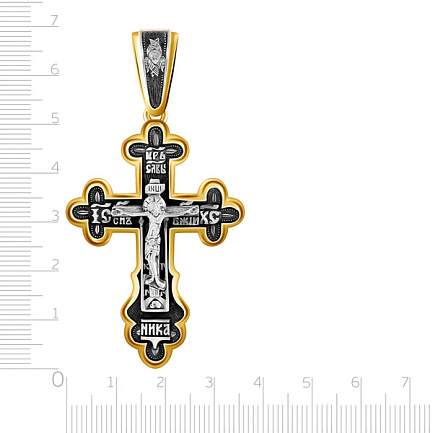 На лицевой стороне креста изображено распятие Господа нашего Иисуса Христа. На обороте — короткая молитва, обращенная к Господу, которая традиционно помещается на нательных крестах: «Спаси и сохрани».