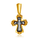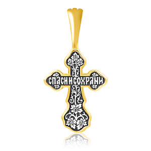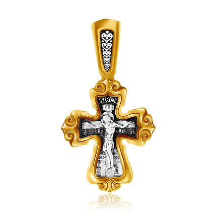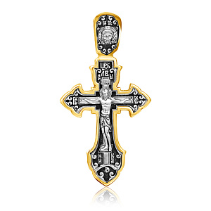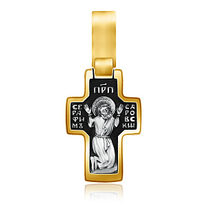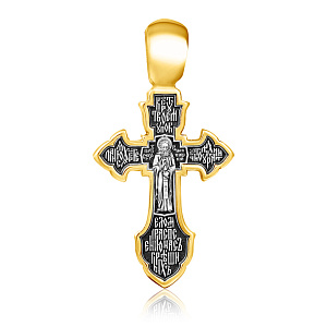 На лицевой стороне креста изображено Распятие Господа Иисуса Христа. На обороте — Валаамская икона Божией Матери, написанная в 1878 году иеромонахом Валаамского монастыря о. Алипием. Икона прославилась чудом исцеления мещанки Натальи Андреевой в 1897 году и с тех почитается как целительница при различных недугах. Божией Матери предстоят блаженные Ксения Петербургсская и Матрона Московская, особо почитаемые верующими за скорую помощь в житейских нуждах. Вверху изображен поклоняющийся Богородице Ангел Хранитель.