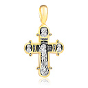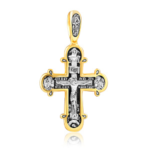 На лицевой стороне креста изображено Распятие Господа нашего Иисуса Христа. С двух сторон Ему предстоят архангел Михаил, главный архангел, воин, который защищает человечество от злых сил и Гавриил, архангел-благовестник. На обороте изображён святой Георгий - один из наиболее почитаемых святых в Христианской Церкви. На Руси он известен как Юрий или Егорий, покровитель воинов, помощник в крестьянском труде. Слева и справа от святого изображены святые мученики, князья Борис и Глеб. Вверху - Казанская икона Пресвятой Богородицы, одна из самых почитаемых в России. Икона была явлена на пожарище в Казани в 1579 году. В 1904 году святыня была похищена и уничтожена, но чудотворную силу иконы Богородица явила во многих ее списках. По молитве к Казанскому образу совершаются исцеления, а также чудеса, связанные с помощью в устроении личной жизни.