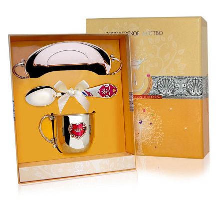 В набор входит серебряная детская кружка «Сердце» с эмалью, ложка детская «Сердце» с эмалью и серебряное детское блюдце. Блюдце 120х15 мм Объем 100 мл Кружка 65х60 мм Объем 150 мл Ложка 140 мм