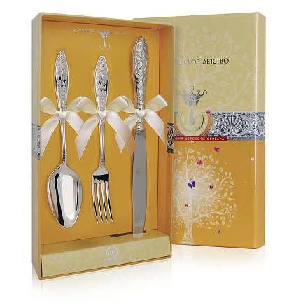 В наборе: Десертная серебряная вилка «Морозко», Десертная серебряная ложка «Морозко», Десертный серебряный нож «Морозко» Вилка десертная 180 мм Ложка десертная 170 мм Нож десертный 210 мм