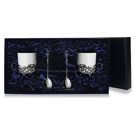В наборе две чашки с подставками из черненого серебра и две серебряные чайные ложки.