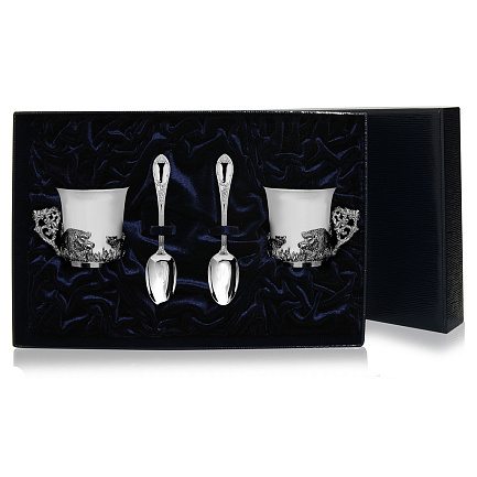 В набор входят: две кофейные чашки с подставками из черненого серебра и две кофейные серебряные ложки.