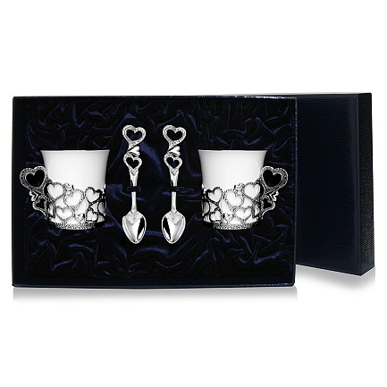 В набор вошли две фарфоровые кофейные чашки с подставками из черненого серебра в виде сердечек и две серебряные кофейные ложки.