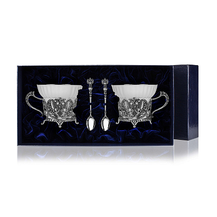 В набор вошли две кофейные чашки и две ложки из серебра.