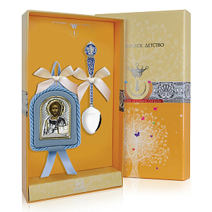 Набор состоит из серебряной ложки 925 пробы с голубой эмалью, вес 14 г, и иконы "Вседержитель", изготовленной из биметалла - сплава серебра с алюминием, размер иконы 7*9 см, имеется свидетельство об освящении. Набор упакован в подарочный футляр. Иконы детские являются точной копией Византийского священного образа. Иконы освящены настоятелем Свято-Введенского храма с. Флорищи протоиреем Вячеславом Булановым (духовником Кольчугинского благочиния). Иконы воспроизведенные с типичными цветами иконографии, с помощью лучшей технологии итальянского качества, с системой покрытия вакуумного напыления серебра 999.5 на основу из алюминия. Такая икона станет отличным подарком малышу (ребенку) на День рождения или крестины. Её можно повесить над кроваткой или положить в коляску.