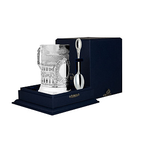 Литой серебряный набор из подстаканника с хрустальным стаканом и чайной ложки. Изготовлен из серебра 925 пробы. Выполнен по старинным технологиям российских мастеров г.Кольчугино