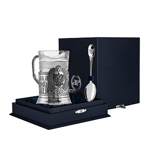 Серебряный набор для чая Герб России состоит из 3-х предметов - подстаканник, ложка чайная, хрустальный стакан.