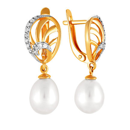 Серьги из красного золота с жемчугом, фианитом