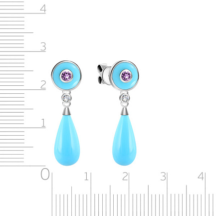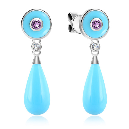 Яркие, оригинальные серьги из белого золота и бирюзы с аметистами и бриллиантами будут стильно смотреться в комплекте с кольцом и подвеской.