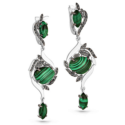 Серьги с английским замком из белого золота с бриллиантами и малахитами