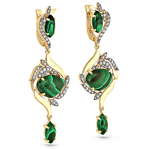 Серьги с английским замком из желтого золота с бриллиантами, малахитами