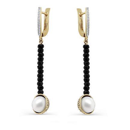 Серьги с английским замком из желтого золота с бриллиантами, ониксами, жемчугами