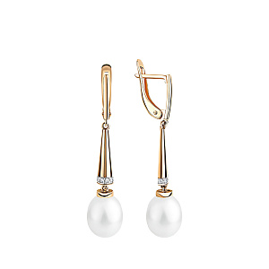 Серьги с английским замком из красного золота с жемчугом и фианитом