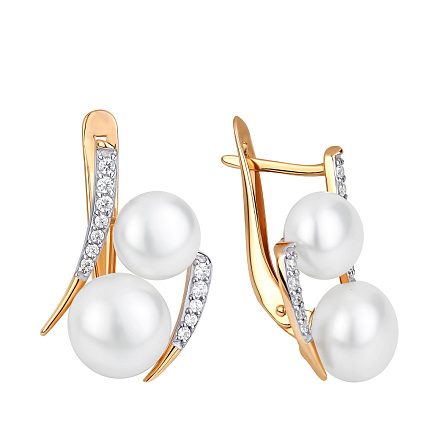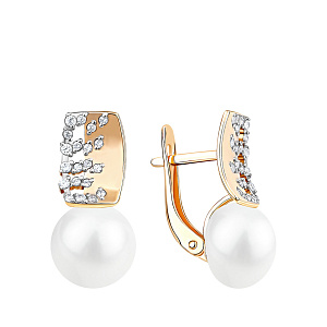 Серьги с английским замком из красного золота с жемчугом и фианитом