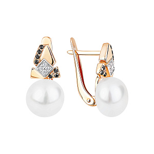 Серьги с английским замком из красного золота с жемчугом и фианитом