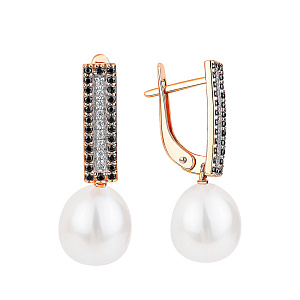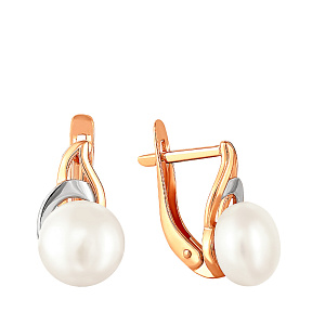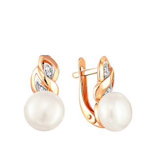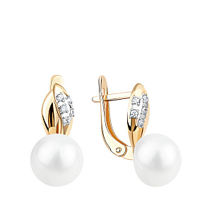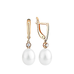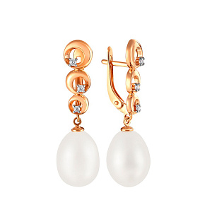 Серьги с английским замком из красного золота с жемчугом и фианитом