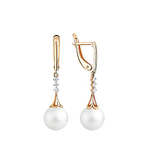 Серьги с английским замком из красного золота с жемчугом и фианитом