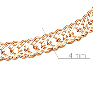 Плетение «Тройной ромбо» отличается формой звеньев, сделанных в виде ромбиков, которые в сцеплении как будто последовательно располагаются внутри друг друга. Это придает дополнительный объем украшению, которое подойдет практически всем. Такое плетение делает цепь из красного золота крепче и надежнее, благодаря чему она гораздо меньше подвержена случайным повреждениям и разрывам. Золотой блеск цепочки добавит шарма любому образу, а прочность и стойкость драгоценного металла к влаге и коррозии не даст украшению утратить своей красоты даже спустя долгое время.