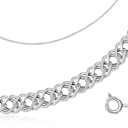 Звенья в цепи с плетением «Двойной ромбо» имеют форму, напоминающую ромбы, которые плотно переплетаются между собой. Такое сцепление делает украшение более крепким и объемным. Благодаря прочности драгоценного металла и его устойчивости к агрессивной среде цепочка из белого золота прослужит долгие годы, привлекая взгляды своим богатым блеском, а также прекрасно дополнит любой образ.
