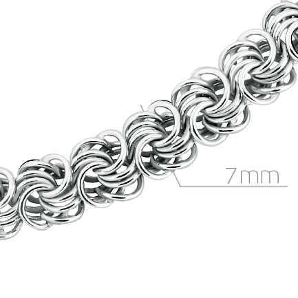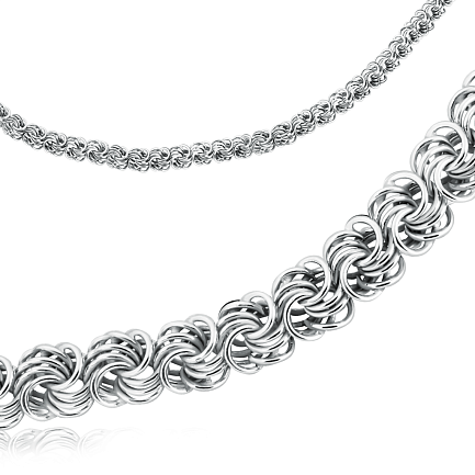 Плетение «Розочка», создаваемое ручным способом, внешне напоминает нежную розу – символ женственности и романтичности. Такая необычная форма достигается за счет сложного сцепления сразу трех или четырех колец каждого звена цепочки, что одновременно делает ее более прочной и надежной при ношении. Представительницы прекрасного пола обязательно оценят красоту плетения цепи из серебра, а за счет влагостойкости и устойчивости к коррозии это украшение будет служить долгое время.